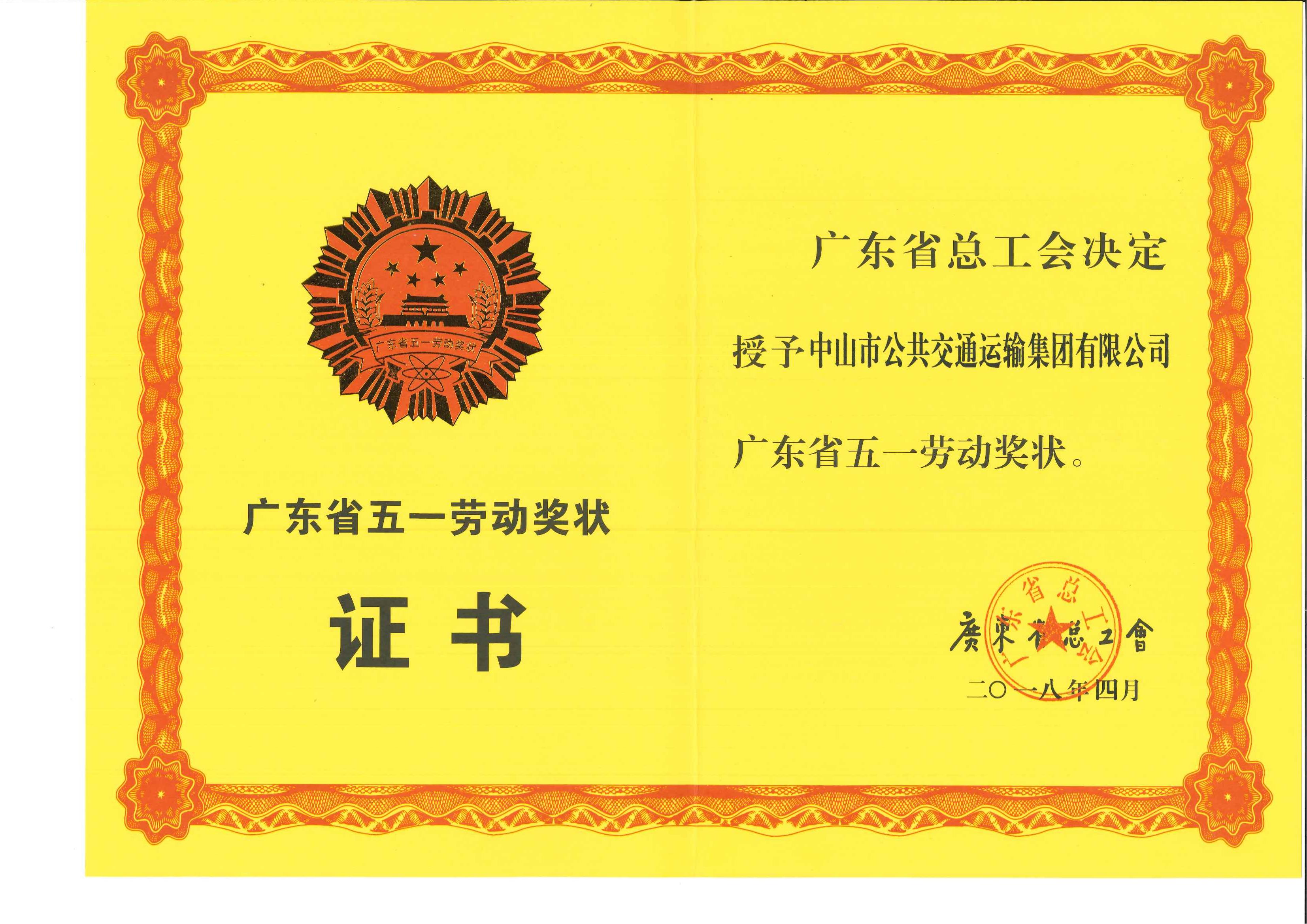 广东省五一劳动奖状证书